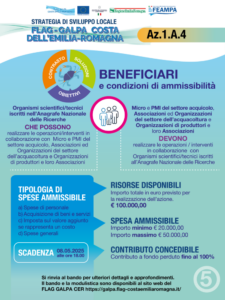 In attuazione della SSL del FLAG GALPA Costa Emilia-Romagna è stato pubblicato il quarto bando di cui alla AZIONE 1.A.1 “Studi, educazione ed eventi – Studi e programmi educativi” Codice Intervento 331214 Operazione 21, 22, 56 collegate agli interventi 111501 AVVISO PUBBLICO Annualità 2025.